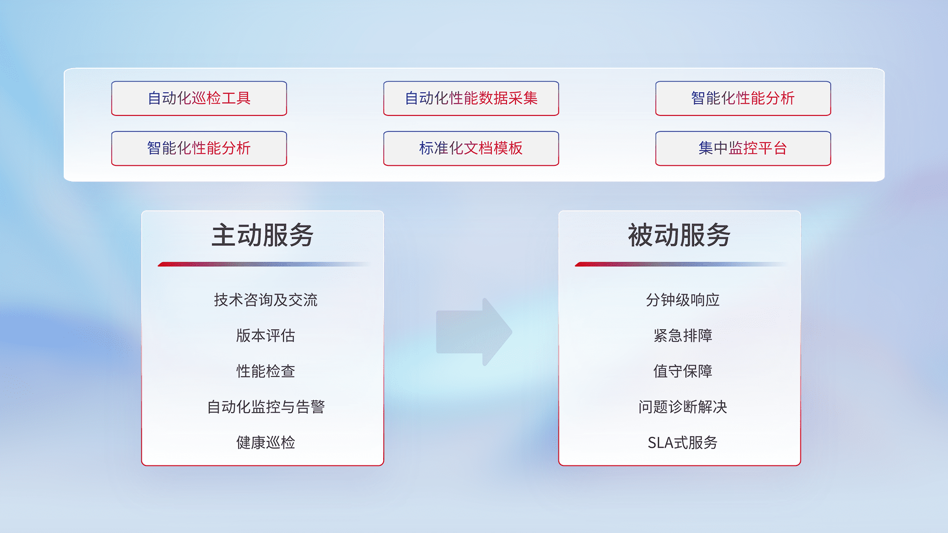 智能化工具和标准化文档,,,保障服务质量,,,,提供主动服务(包含技术咨询、、、版本评估、、、性能检查、、自动化监控与告警、、健康巡检)和被动服务包含(分钟级响应、、、、紧急排障、、、、值守保障、、、问题诊断解决、、、SLA服务)。。。。