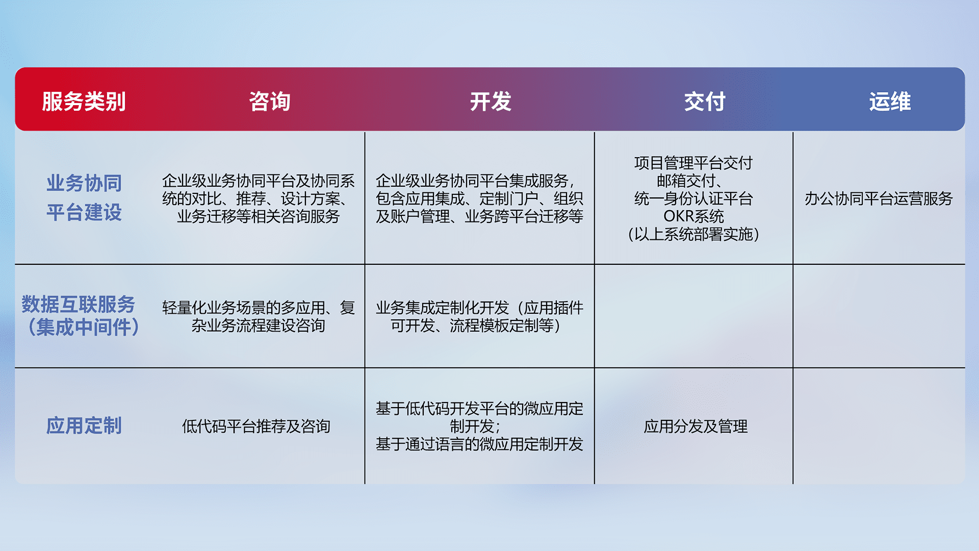 针对钉钉、、、、企微、、IDaas等平台级产品提供产品的规划、、方案、、、、交付、、、、定制化开发等服务,,实现如统一协同办公、、、智能客户服务、、、、混合会议管理、、、、智能数据查询、、等业务场景,,,,实现数字化转型。。。